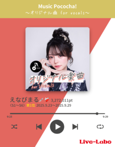 この度、Pocochaイベントに以下のライバーさんが入賞されましたのでご報告致します。 【イベント名】 Music Pococha! 〜オリジナル曲 for vocals〜 【ランク帯】 S1~S6 【イベントランキング】 第1位 えなぴまる💉❤️🩹 3,272,011pt 【イベント期間】 2025.9.23~2025.9.29 このイベントは入賞する…