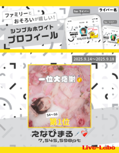この度、Pocochaイベントに以下のライバーさんが入賞されましたのでご報告致します。 【イベント名】 ファミリーとおそろいが嬉しい!シンプルホワイトプロフィール 【ランク帯】 S4~S6 【イベントランキング】 第1位 えなぴまる💉❤️🩹 7,545,598pt 【イベント期間】 2025.9.14~2025.9.18 このイベントは入賞すると、「ライ…