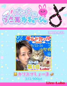 この度、Pocochaイベントに以下のライバーさんが入賞されましたのでご報告致します。 【イベント名】 ピンキのうさ耳カチューシャ 【ランク帯】 A1~A3 【イベントランキング】 第1位 🐱カリスマしょーま🍻 312,900pt 【イベント期間】 2025.9.22 このイベントは入賞すると、「ピンキのうさ耳カチューシャ」がプレゼントされます! 🐱…