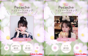 この度、2025年9月度の月間ランキングの集計が完了しましたので、発表させていただきます。 ・Pococha 応援ポイント部門 第1位 えなぴまる💉❤️🩹 第2位 𖤐わらし。🐻❄️໒꒱·̩͙ 第3位 遊汰様🌙✞ 第4位 ゆきちゃん☃️ 第5位 しんじゅ🦄💖 第6位 あの 第7位 ⋆✦🩵なるみ🩵✦⋆ 第8位 💜🐱ゆいころ🐱💜 第9位 🔲🔳M A❤️🔥…