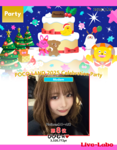 この度、Pocochaイベントに以下のライバーさんが入賞されましたのでご報告致します。 【イベント名】 POCO LAND 2025 Celebration Party モダン ABCランク 【ステージ】 Platinum(A1~A3) 【イベントランキング】 第8位 ぴぴむ🐈⬛♥️ 3,320,772pt 【イベント期間】 2025.12.24 このイ…