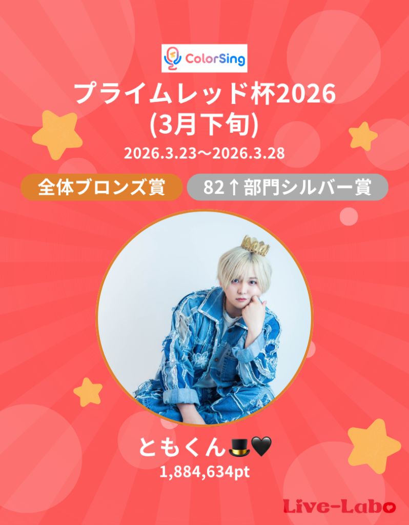 この度、ColorSing パール杯に以下のライバーさんが入賞されましたのでご報告致します。 【イベント名】 プライムレッド杯2026(3月下旬) 【入賞】 ・ともくん🎩🖤 1,884,634pt 🏆全体ブロンズ賞 🏆82↑部門シルバー賞 【イベント期間】 2026.3.23~2026.3.28 ともくん🎩🖤さんおめでとうございます!!