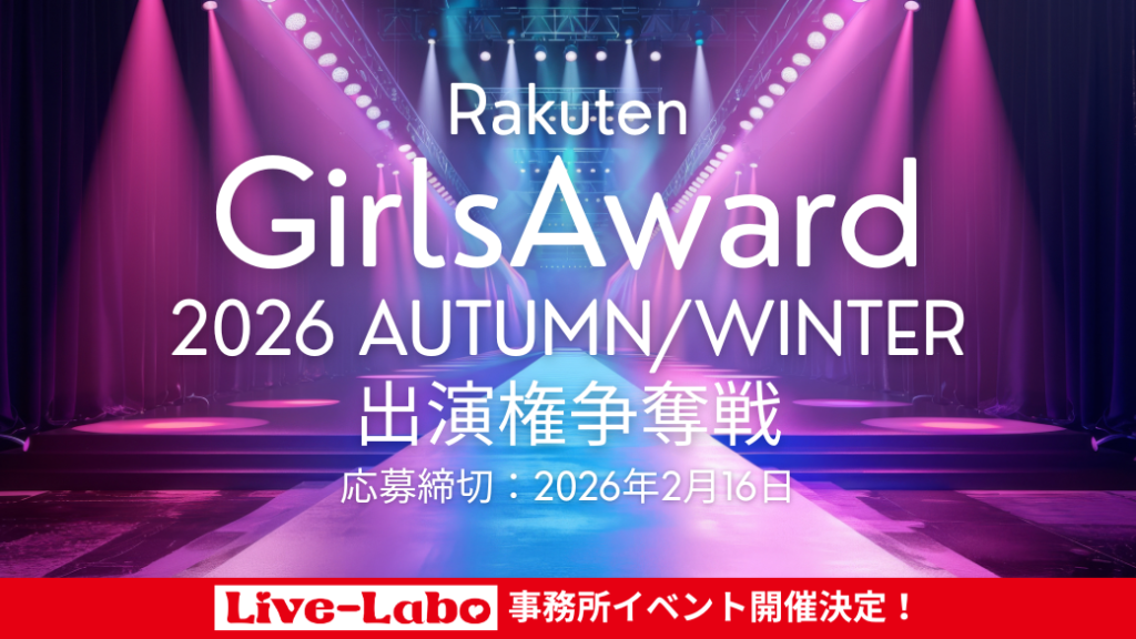 この度、Live-Labo事務所イベントの開催が決定しました! 1位を獲得したライバーさんには、「Rakuten GirlsAward 2026 AUTUMN/WINTER」への出演権をプレゼントします。 「配信を通じて夢を叶えたい」 「大きなステージに挑戦してみたい」 そんな想いを持つライバーさんに、ぜひ参加していただきたいイベントです。 少しでもご興味のある方は、ぜひこの機会にご参加ください! 詳しくは担当マネージャーもしくは公式LINEからお問い合わせください。