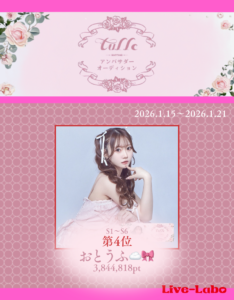 この度、Pocochaイベントに以下のライバーさんが入賞されましたのでご報告致します。 【イベント名】 『tulle』アンバサダーオーディション 【ランク帯】 S1~S6 【イベントランキング】 第4位 おとうふ☁🎀 3,844,818pt 【イベント期間】 2026.1.15~2026.1.21 このイベントは入賞すると、「撮影セッション参加権」がプレゼ…