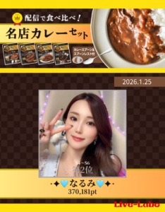 この度、Pocochaイベントに以下のライバーさんが入賞されましたのでご報告致します。 【イベント名】 配信で食べ比べ!名店カレーセット 【ランク帯】 S4~S6 【イベントランキング】 第2位 ⋆✦🩵なるみ🩵✦⋆ 370,181pt 【イベント期間】 2026.1.25 このイベントは入賞すると、「名店カレーセット」がプレゼントされます! ⋆✦🩵な…