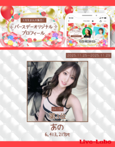 この度、Pocochaイベントに以下のライバーさんが入賞されましたのでご報告致します。 【イベント名】 1月生まれ集合!バースデーオリジナルプロフィール 【ランク帯】 S4~S6 【イベントランキング】 第3位 あの 6,413,217pt 【イベント期間】 2025.11.25~2025.11.29 このイベントは入賞すると、「ライバー名入れオリジナルプ…