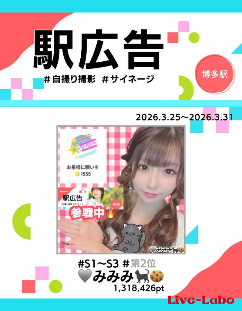 この度、Pocochaイベントに以下のライバーさんが入賞されましたのでご報告致します。 【イベント名】 博多駅広告 【ランク帯】 S1~S3 【イベントランキング】 第2位 🩶みみみ🐈⬛🍪 1,318,426pt 【イベント期間】 2026.3.25~2026.3.31 このイベントは入賞すると、博多駅に掲載されるサイネージ広告に出演することができます! 掲載予定期間は、2026年6月中旬~2026年8月上旬の中で1週間になります。 🩶みみみ🐈⬛🍪さん、おめでとうございます🎊㊗