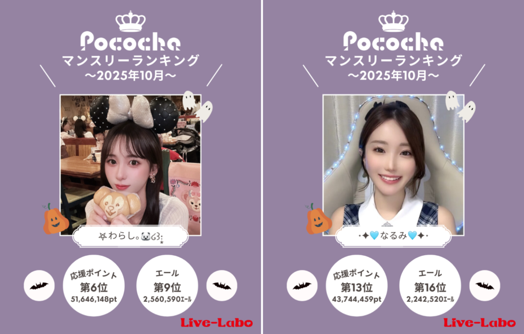 2025.10月度にPocochaで配信を行った全ライバーさんの中で上記のライバーさんが応援ポイント部門、エール部門でトップ20に入賞致しました!